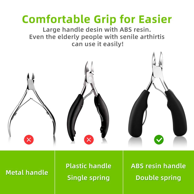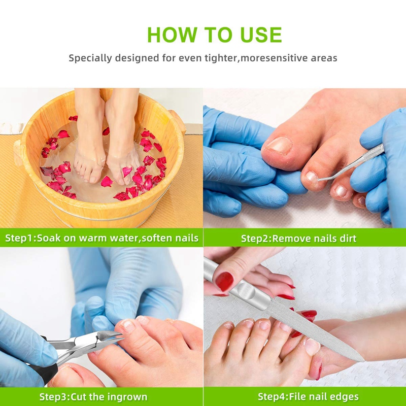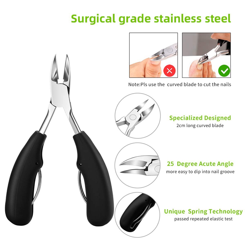 [SELECTED KIT] Professional ingrown toe nail clippers tools kit(4-in-1), superior stainless steel refined. It's hard, sharp, antirust and durable, so these nail tools are also the first choice for dealing with thick and hard nails. [UPGRADED CLIPPER] Nail clippers with non-slip ergonomic handle and large opening, takes less hand force to cut all size nails, including ingrown toenail, thick toenail, hard nail, grey nail, grooved nail etc. The sharp curved blade edge like eagle mouth fits the nail arc closely, is good at deeping into the nail groove to trim ingrown toenails. [SPECIAL FILE] This 4 side nail file can be used for manicure of hard and thick toenails and can make your nails smoothly. [SUPPORTING TOOLS]The 2-in-1 double ended pusher can push down cuticles, the polish gel residue,the dead skin and top coat on nails. The nail lifter with mini spoon can clean the debris or dirty inside nails. Tips: Be sure to push only one spring to the side of the cutting edge before use the clipper. Do not use the double spring at the same time Keep the set out of reach of children Pay attention to safety to avoid accidental injury Color: Black + Silver Material: Plastic + Metal Package Contents: 1 * Nail Lifter 3 * accessories