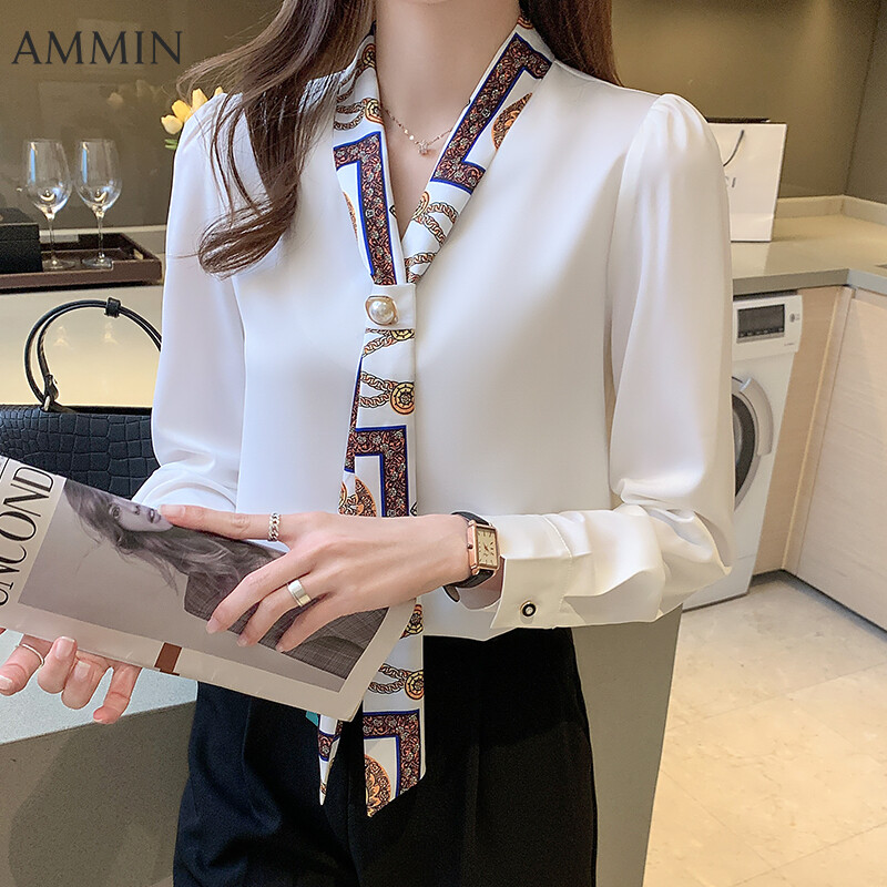 AMMIN Korean Style Slim All-match Chiffon Shirt For Women Long Sleeve V-neck Fashion Lace-up Top Lady Design Blouse