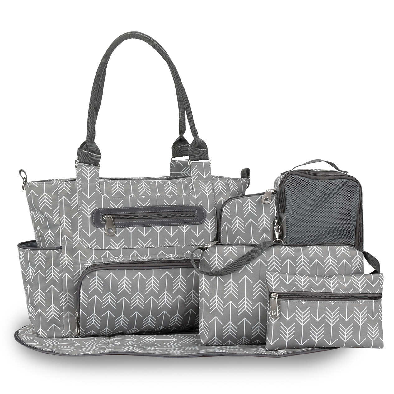 7-piece diaper bag set: 1. Extra roomy main compartment, diaper bags with multiple pockets, reliable zip-top closure, with carrying strap.