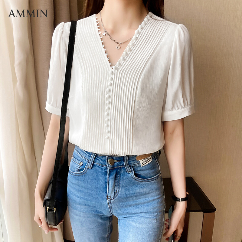 AMMIN Tops 2021 summer new style Korean version of pleated V-neck Western style elegant short-sleeved chiffon shirt women's single-breasted buckle buttons embellished sweet commuter women's blouse
