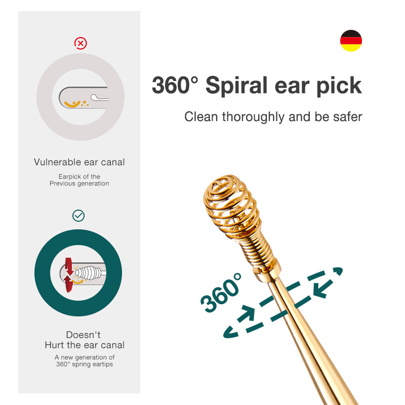2. Flexible spiral head design, can be 360 ° comprehensive cleaning of ear canal, fit ear canal better, adapt to various shapes of ear canal, clean more thoroughly and safely;