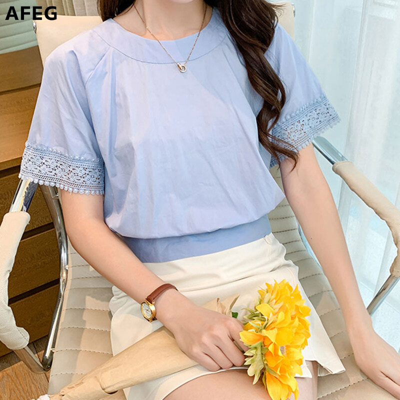 AFEG Round neck lace back lace shirt women slim slimming hollow short-sleeved blouse