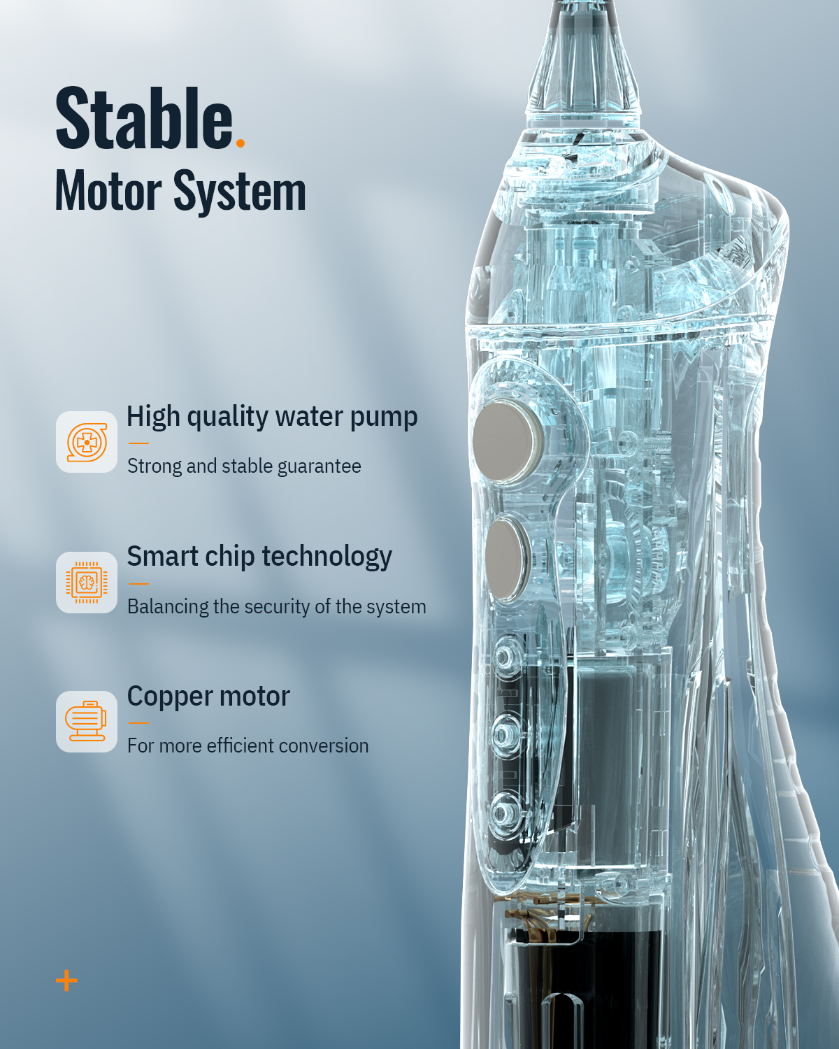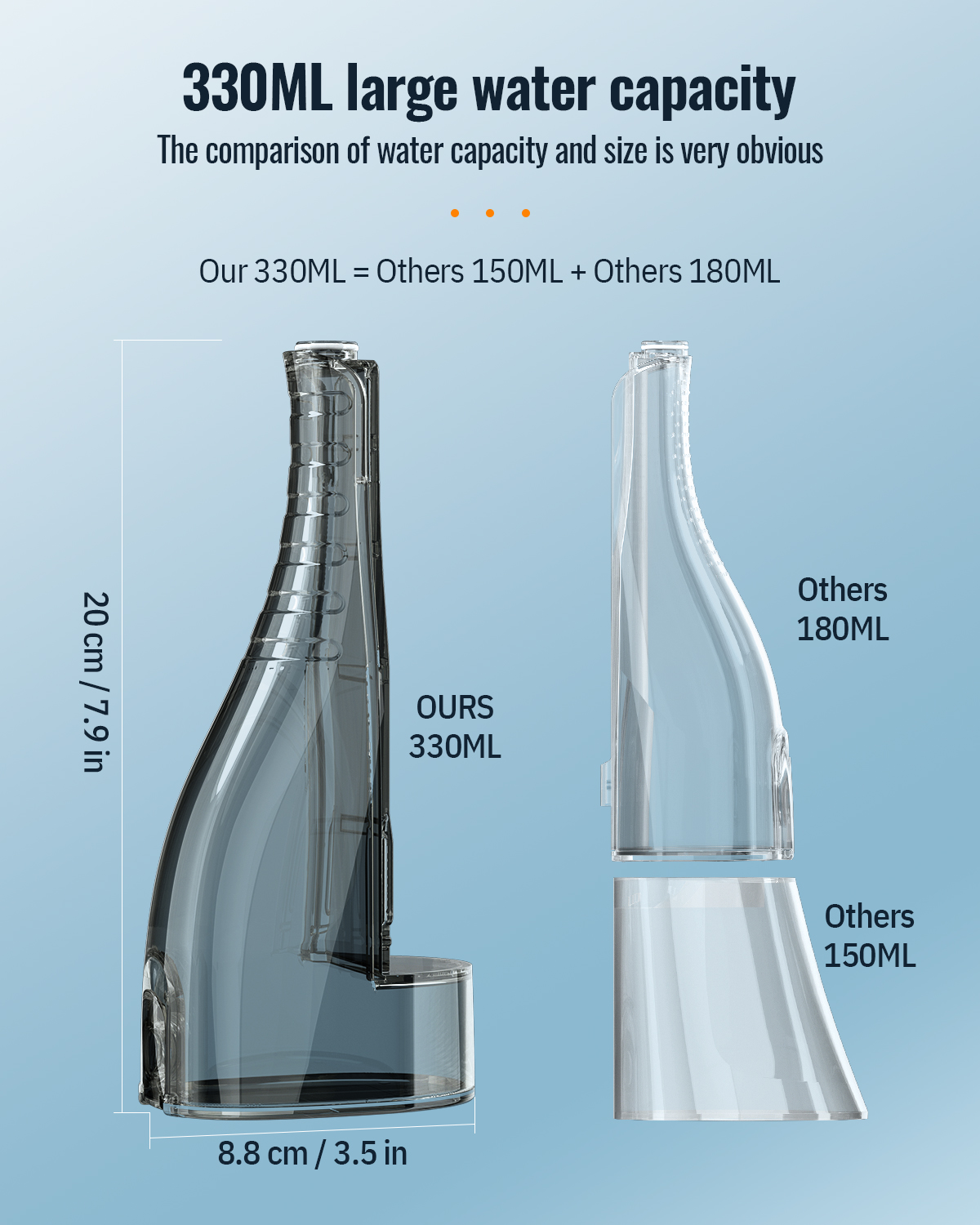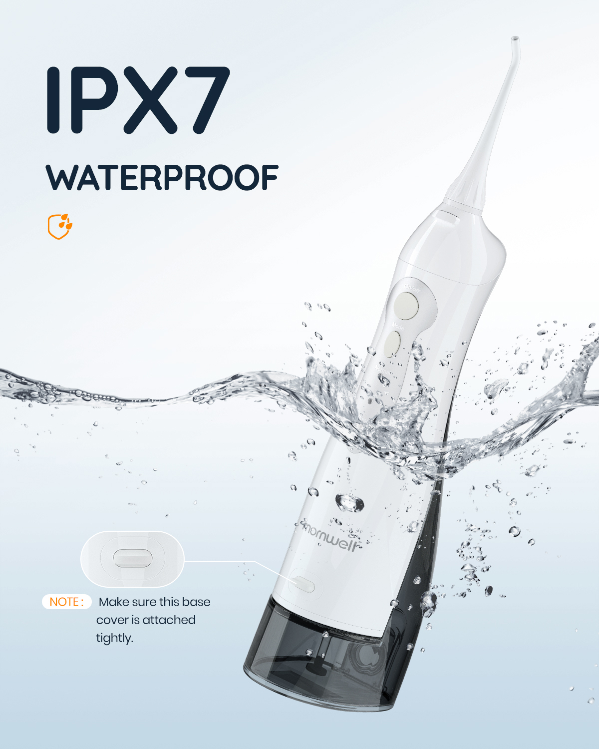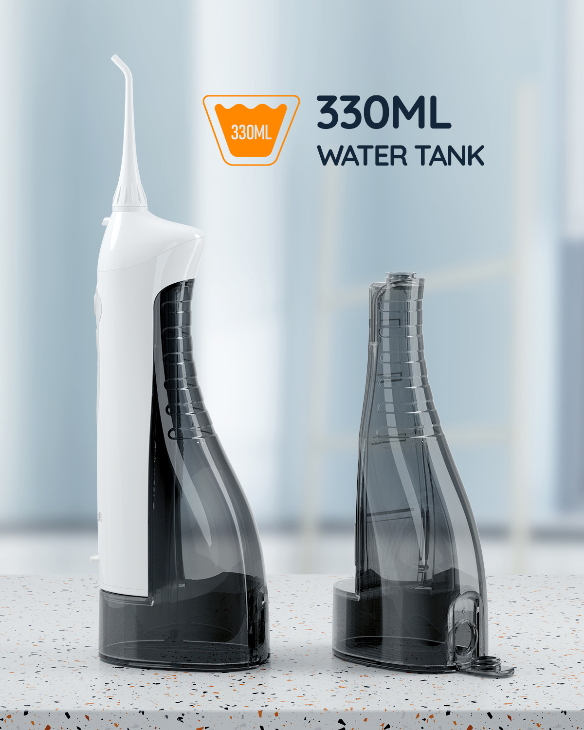 【330ml Large Water Tank】This portable dental flosser with 330ml large reservoir can offer 75s uninterrupted water flows for you, enough for cleaning your oral at one time. IPX7 waterproof design allows the dental flosser to be used in the shower.