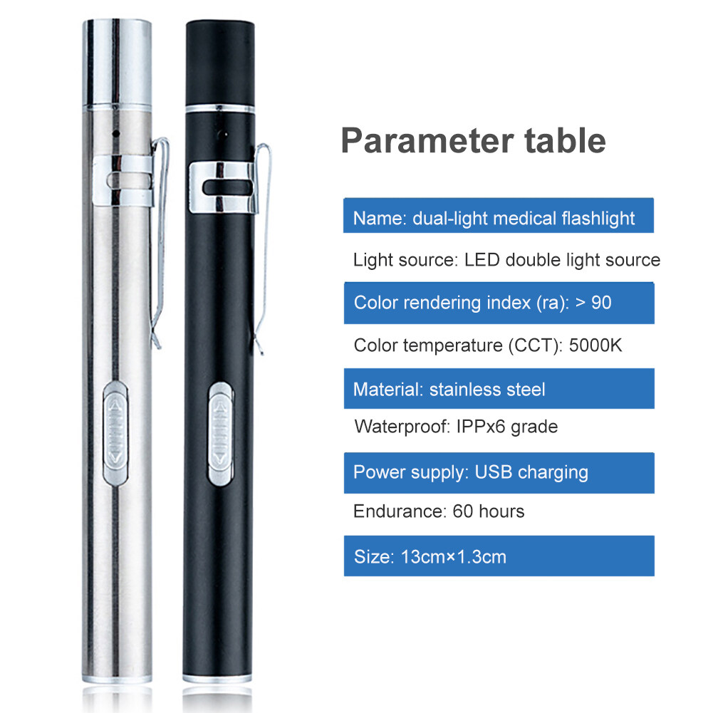 Scope of application: medical pen light, white light color clear for otolaryngology, sore mouth examination. The yellow light color is suitable for ophthalmology. Portable pen holder for easy carrying.