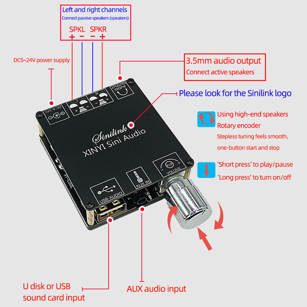 This product can continuously output 50W*2 power amplifier, 10W~200W speakers can be pushed, 8 ohms or 4 ohms speaker is recommended.