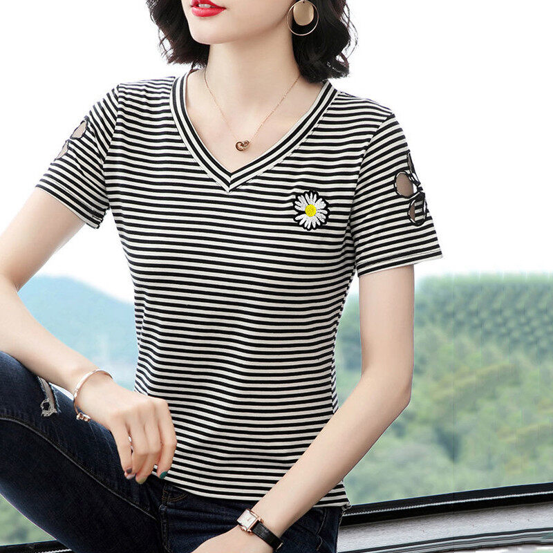INWPLLR Women Tshirts Daisy Embroidery T-Shirts Fashion V-Neck Stripe Tops Ladies Flower Hollow Short Sleeve Top Tees Large Size