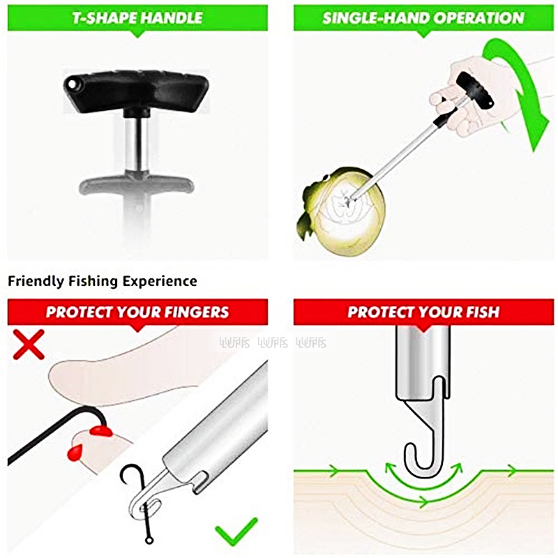 The hook remover will keep your fingers away from sharp fish teeth.