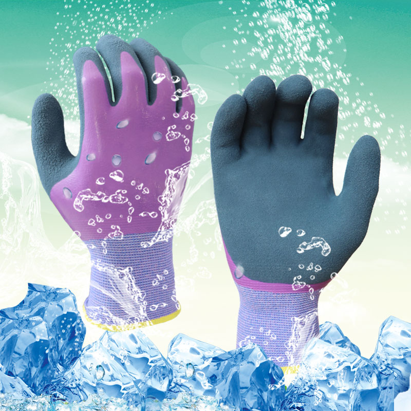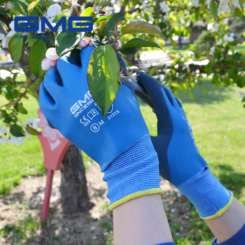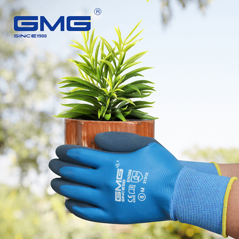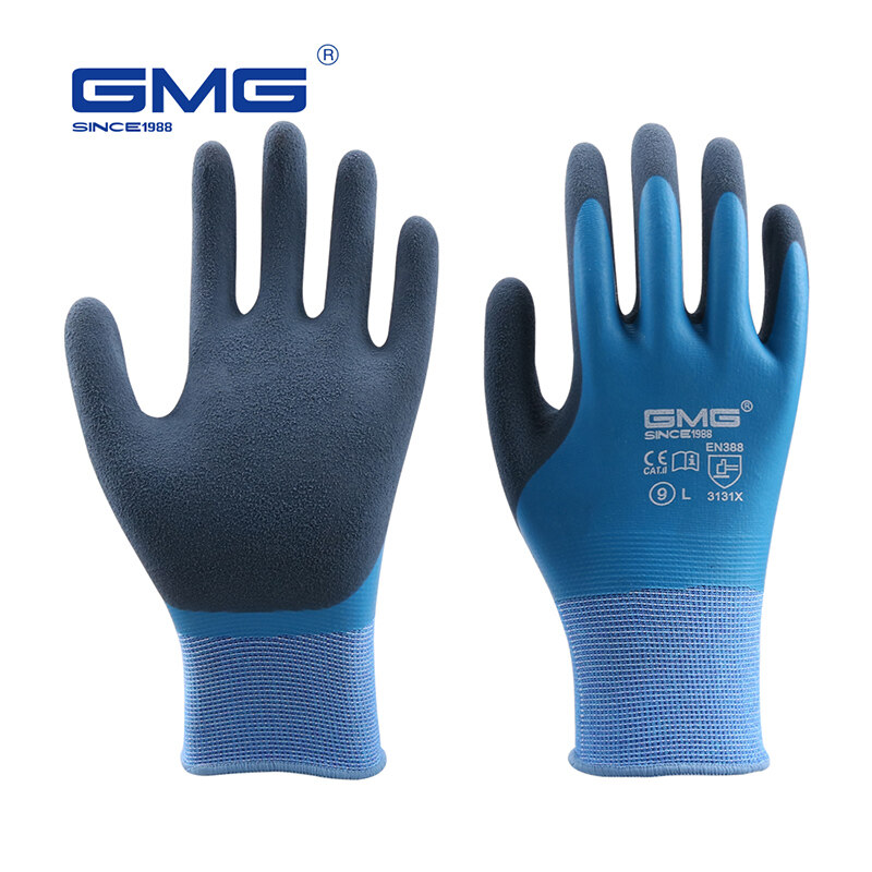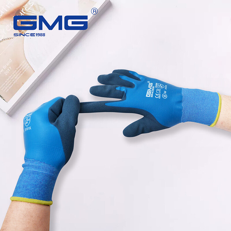 GMG safety gloves waterproof work gloves blue Polyester good adhesion wear resistant durable grey latex safety gloves work gloves good quality