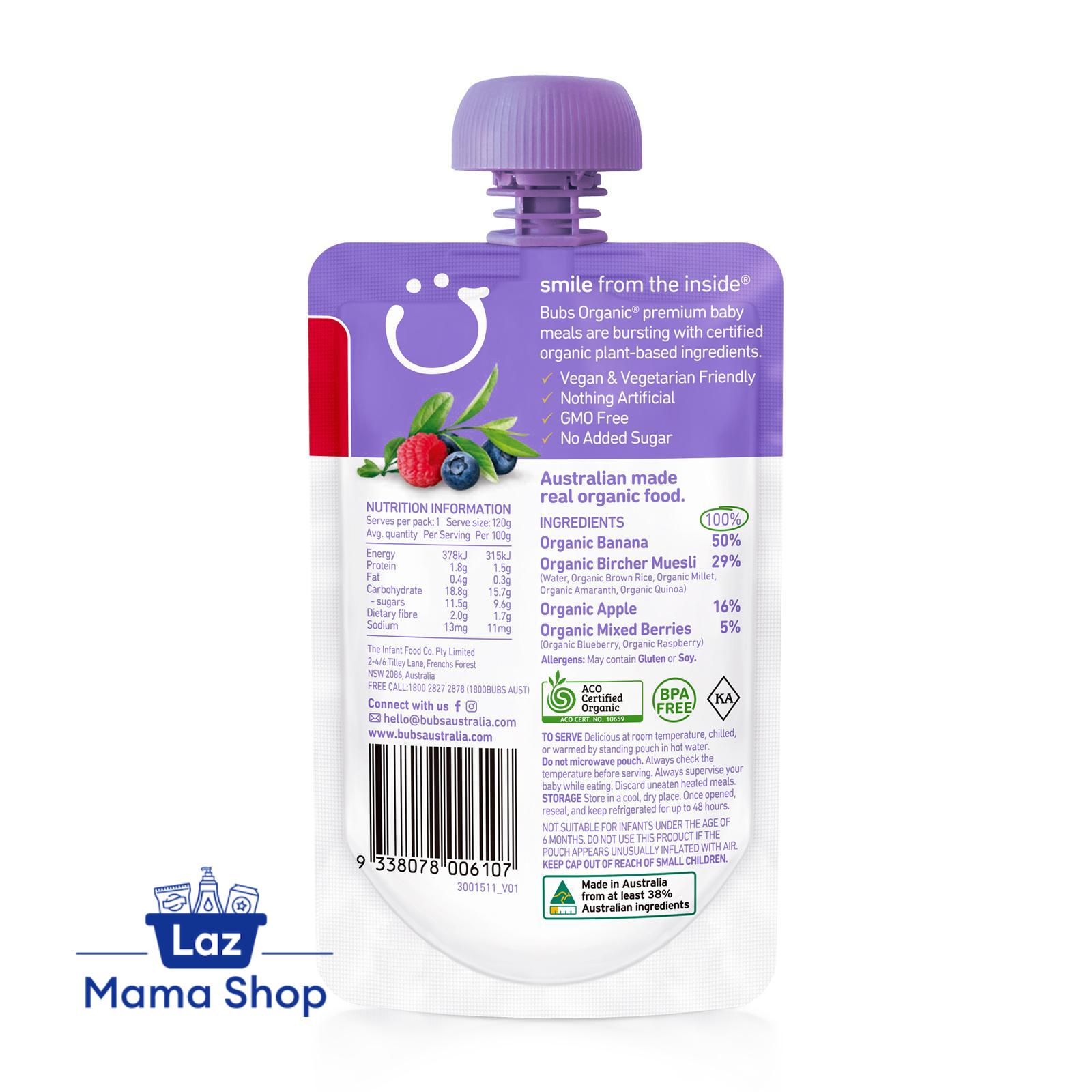 Organic Banana 83%, Organic Bircher Muesli (Water, Organic Brown Rice, Organic Millet, Organic Flaxseed, Organic Quinoa) 29%, Organic Mixed Berries 2%, Vitamin C < 1%.