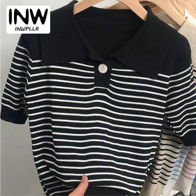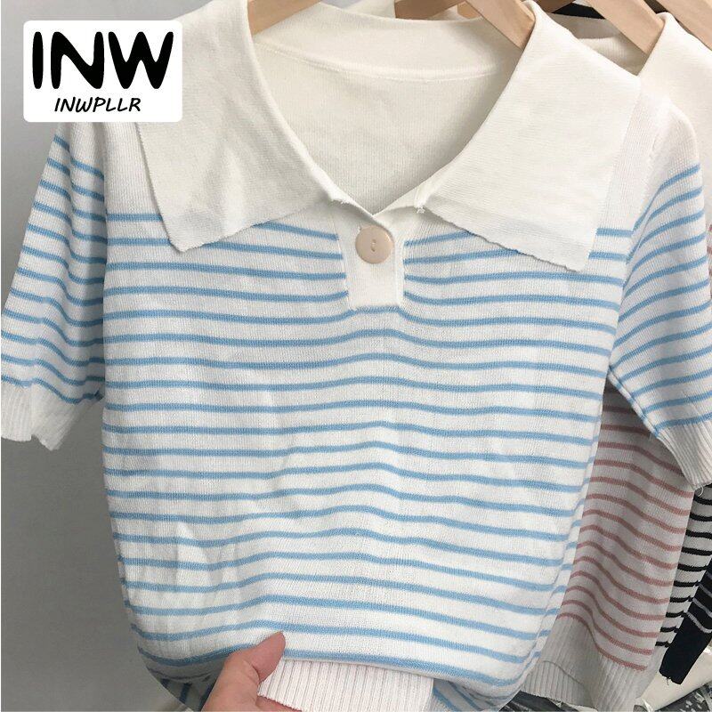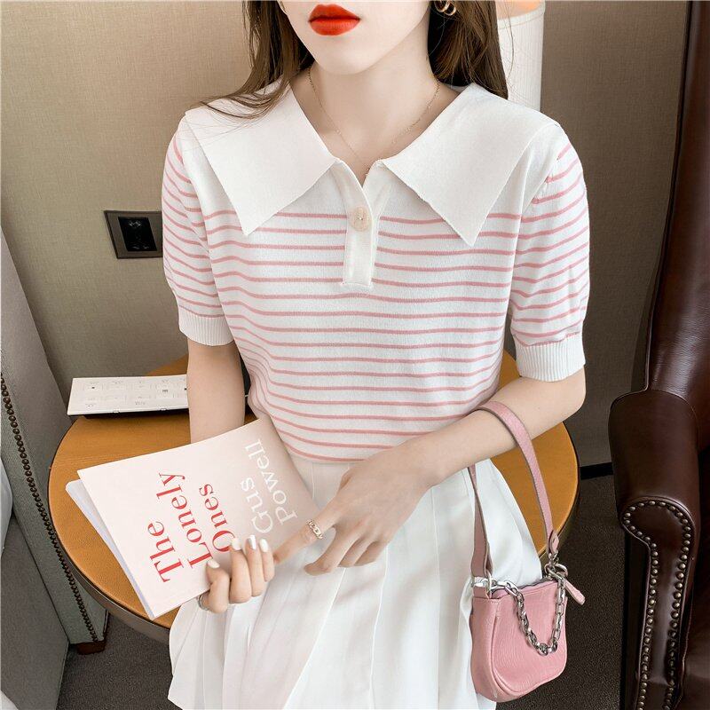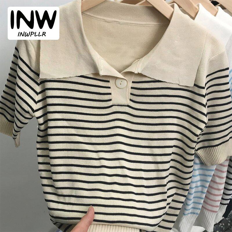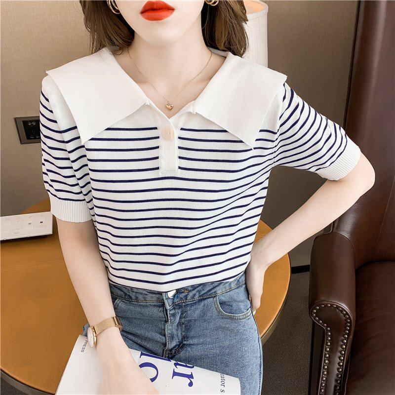 INWPLLR Pretty Navy Neck Chic Tops Women's Western Style Striped T-Shirts Leisure Fashion Short-sleeves T-shirts Lady