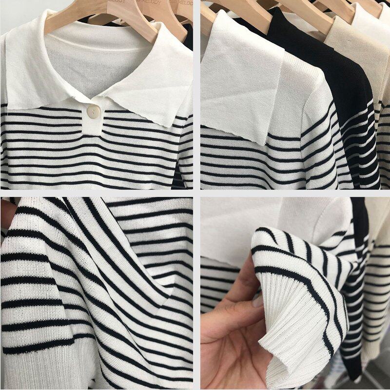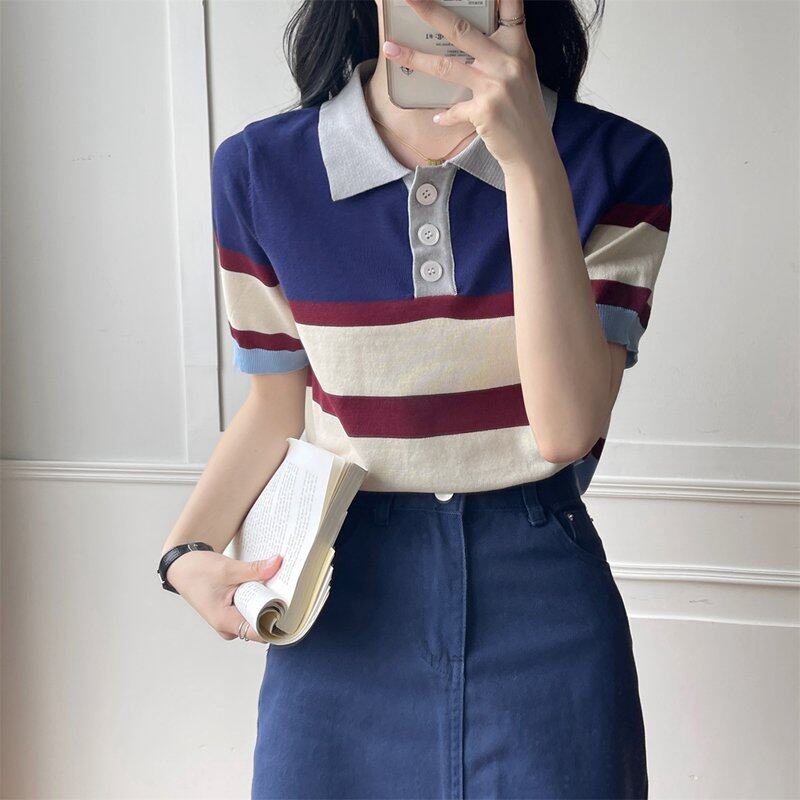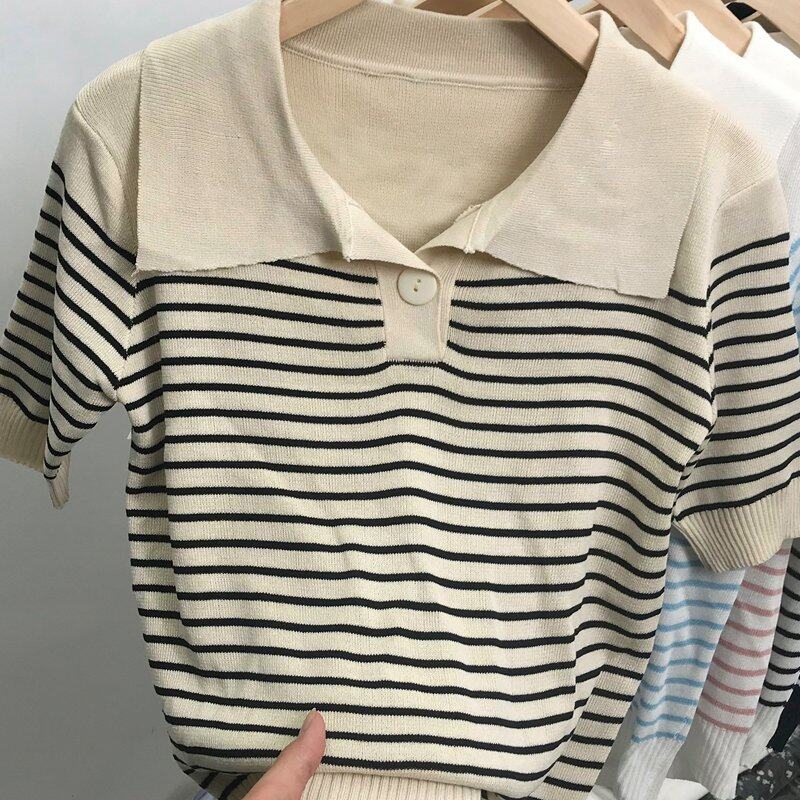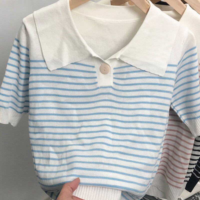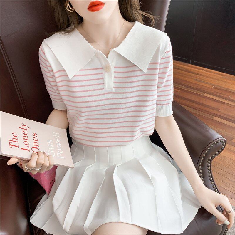 INWPLLR Pretty Navy Neck Chic Tops Women's Western Style Striped T-Shirts Leisure Fashion Short-sleeves T-shirts Lady