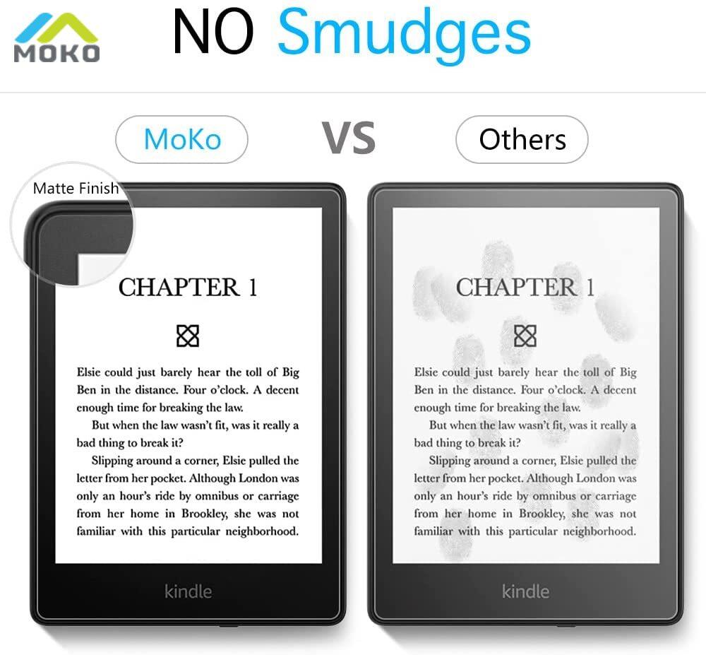 MoKo Anti-Glare Screen Protector designed specifically to fit your Kindle Paperwhite 2021 Reduce Glare The matte surface defuse light and help reduce reflection, providing a more comfortable viewing experience. 2 Pack Double Protection No matter your protector got worn or you failed to apply the anti-glare screen protector, there is a spare one for you. Or you can share it with your best friend who needs it just like you do. Quick & Easy Installation With the provided user manual and cleaning tools, you can apply this protector easily and quickly. Note: If re-application is needed 1. Remove the protector with caution. Using too much force may damage the adhesive layer. Try prying open at different spots each time when removing the protector. 2. There is no need to wash the screen protector. Please clean the dust in advance, and press the screen protector for a while when you are installing. Package Includes - 2 x Anti-Glare Screen Protector - 2 x Wet Wipes - 2 x Squeeze Card - 2 x Cleaning Cloth - 2 x Dust Removal Stickers - 1 x User Manual