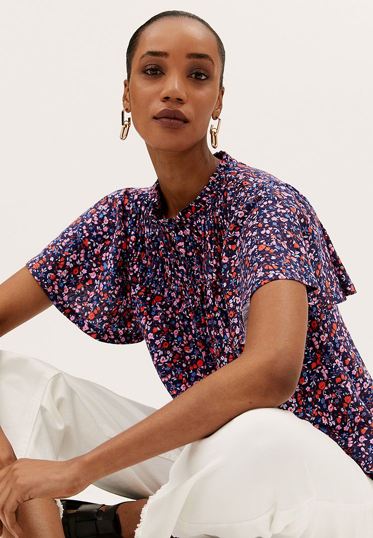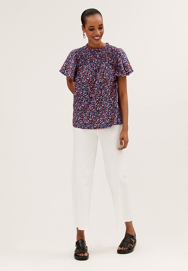 M&S Pure Cotton Floral Shirred Short Sleeve Top
