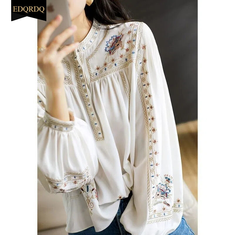 EDQRDQ Floral Bohemian Tops Muslim O Neck Puff Sleeve Elegant Blouses for Women