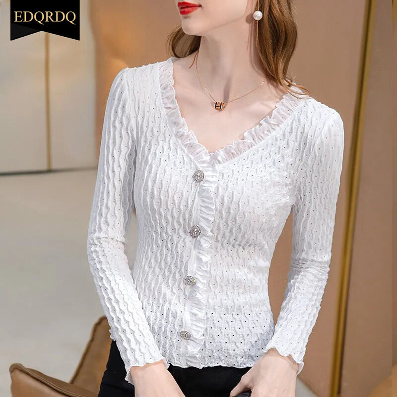 EDQRDQ Elegant Chiffon Tops Falbala Ruffles V Neck Button Blouses for Women
