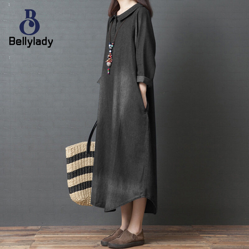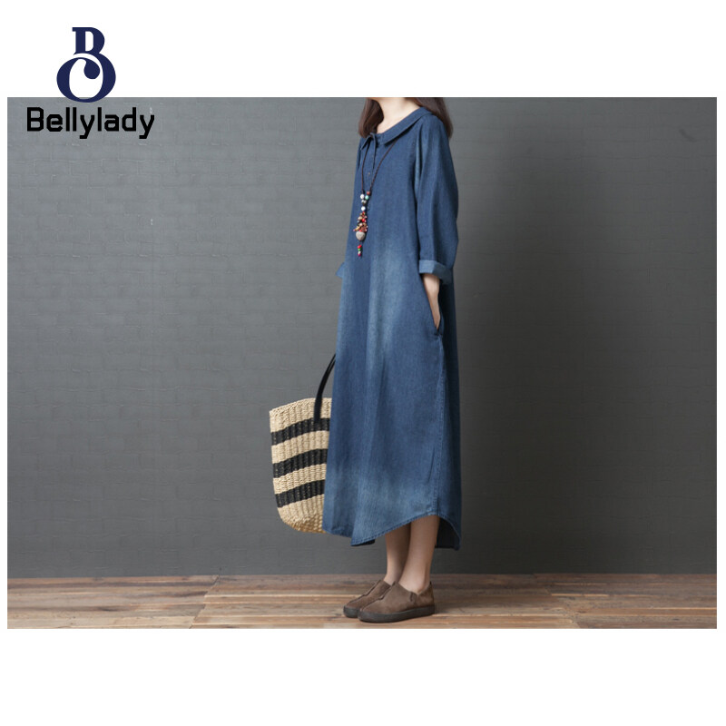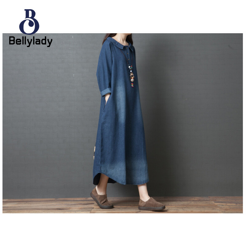 Women Denim Shirt Dress Fashion Lapel Long Sleeves A-line Skirt Loose Large Size Midi Skirt