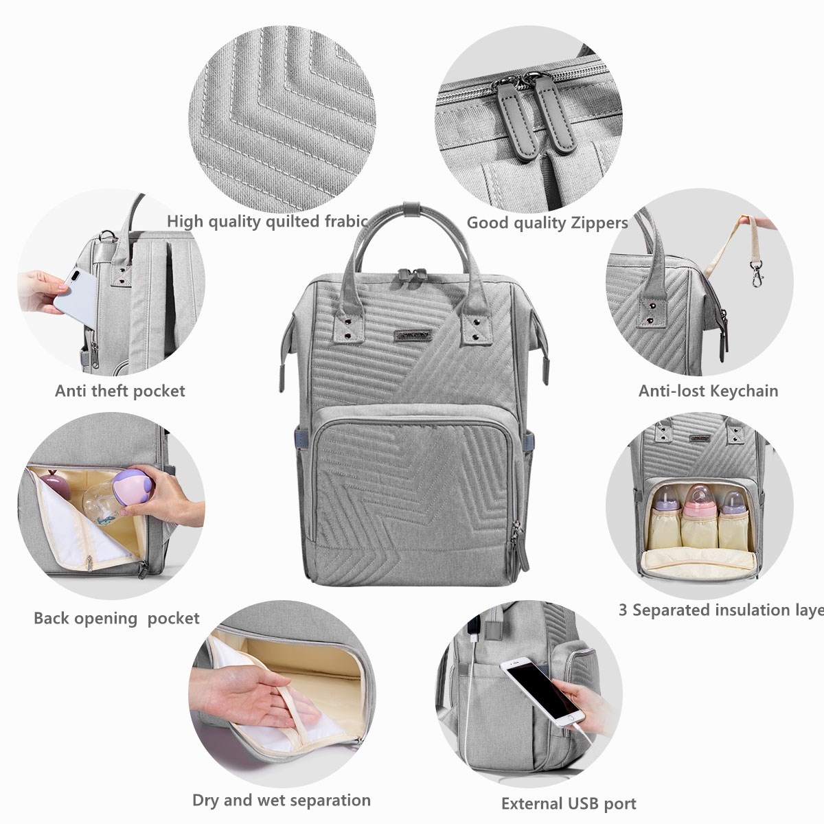 Tote around everything you need for babies, infants, and toddlers with this baby diaper bag backpack that features 13 storage pockets and a USB port, complete with zippers for easy closure and three insulated pockets for bottles, snacks and more.