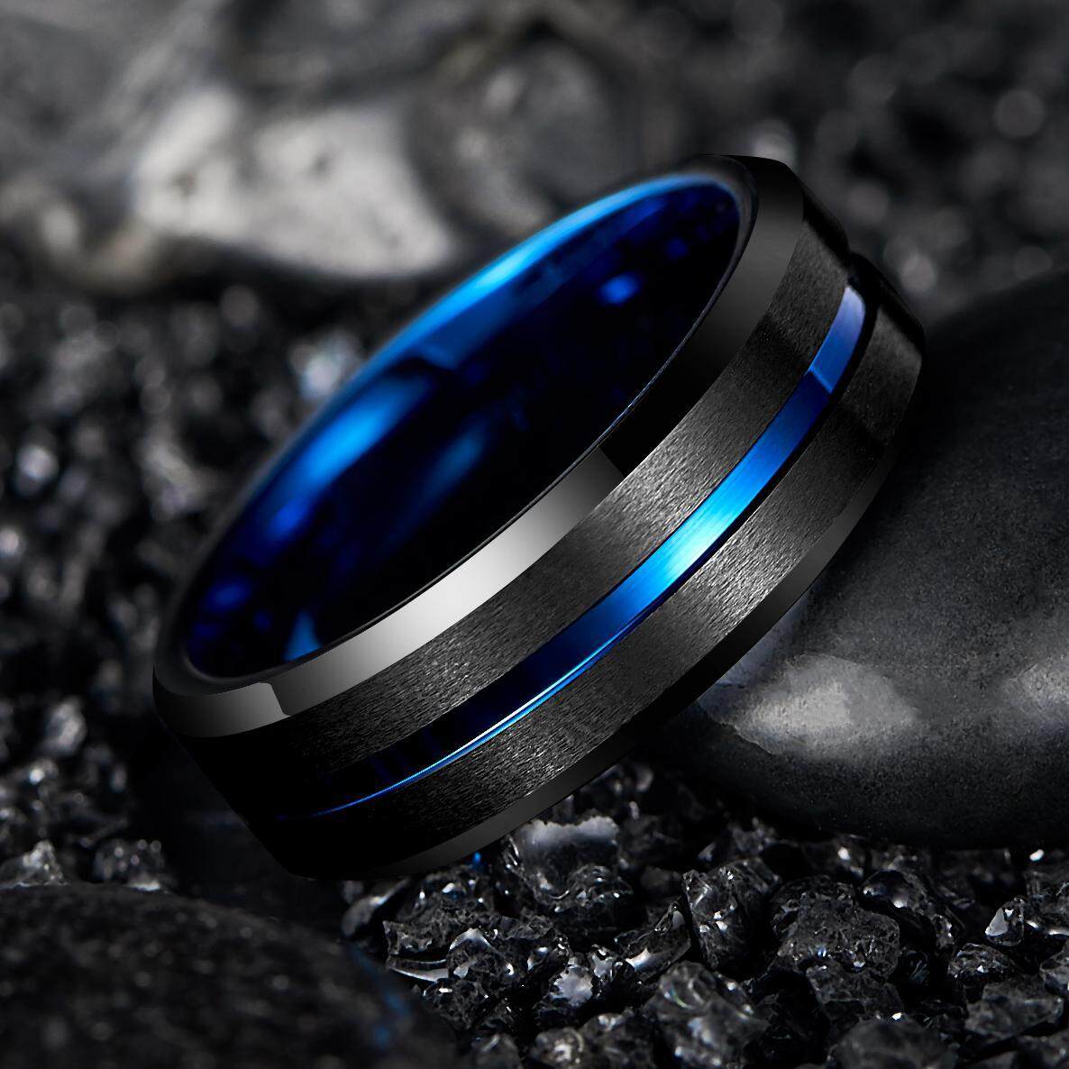 AVECON 【Support Engrave】8MM Tungsten Carbide Ring Balck and Blue Domed Brushed Finish